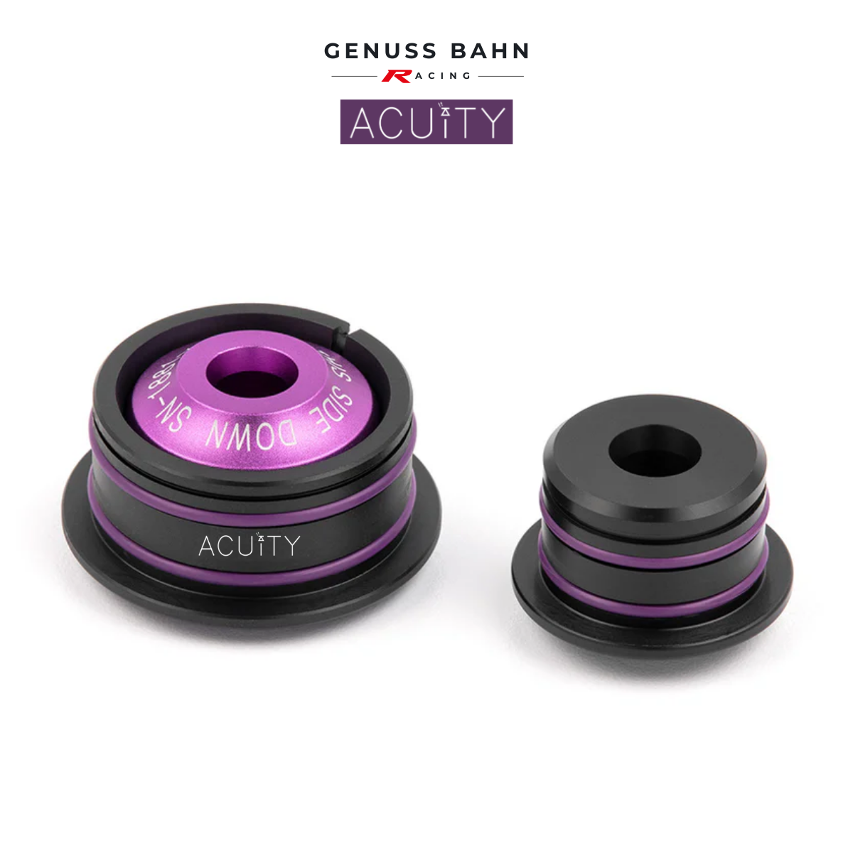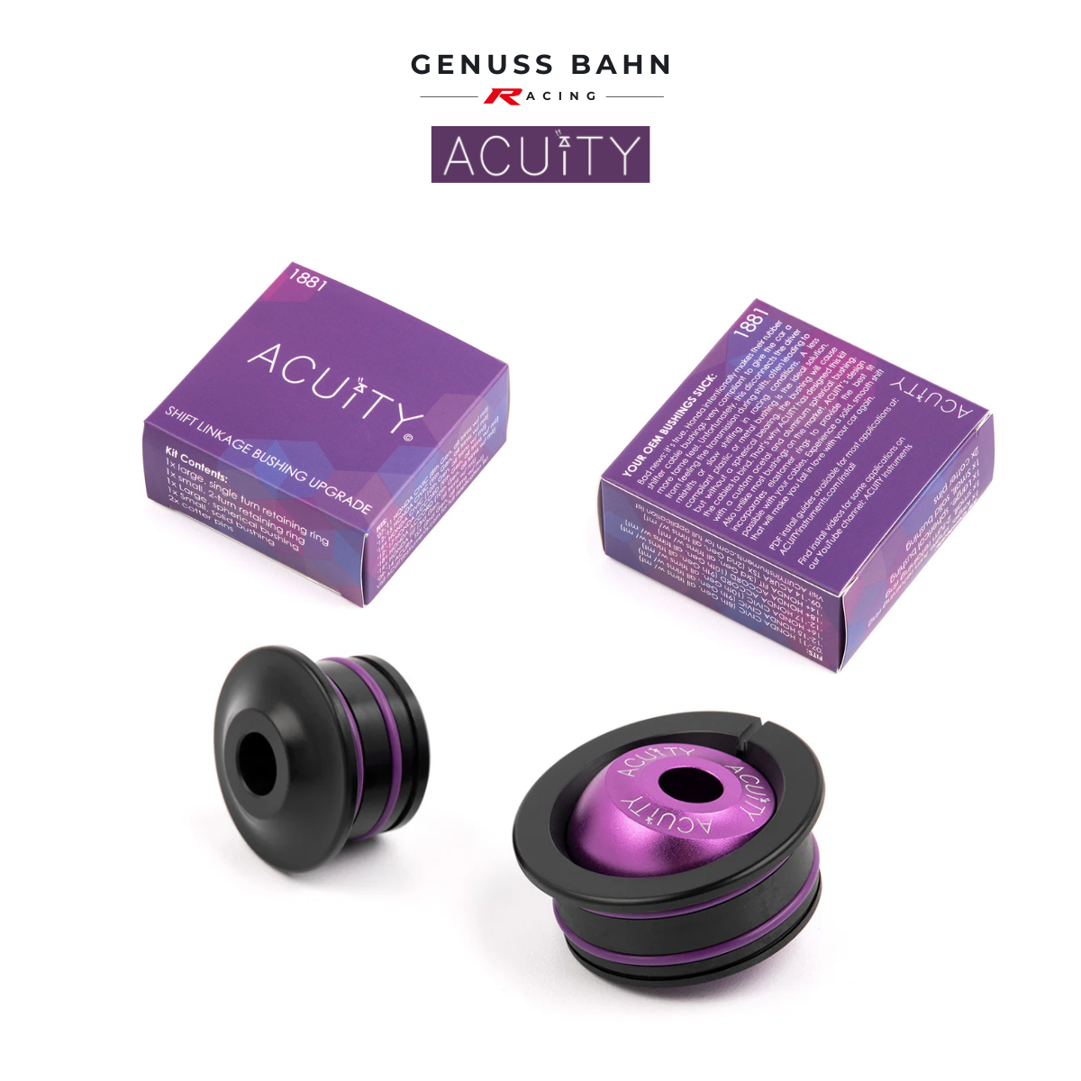 Years of experience have taught the engineers at ACUITY that there are many elements to a refined, responsive shift. Compliance from flimsy components in the shift linkage leave the driver feeling detached from the transmission. ACUITY combats this by replacing the OEM rubber bushings with much stiffer Acetal and 6061-T6 Aluminum. A large-diameter, custom spherical bearing minimizes long-term wear and tear while eliminating the binding that is caused by most aftermarket solid shifter cable bushings. Loose fitting components also contribute to a poor shifting feel. That’s why ACUITY uses integral o-rings on the outside of each bushing to provide a perfect fit with your OEM cables. Tested on street cars, track cars, and ACUITY’s unreasonably violent shifter testing machine, these bushings are designed to be robust and proven to last. Each bushing kit is laser etched with a unique serial number and includes stainless steel hardware to help prevent long-term corrosion, keeping your bushings looking great even longer. And if all of that isn’t impressive enough, the bushings are over 20% lighter than their OEM counterparts, weighing in at only 48 grams (with hardware).