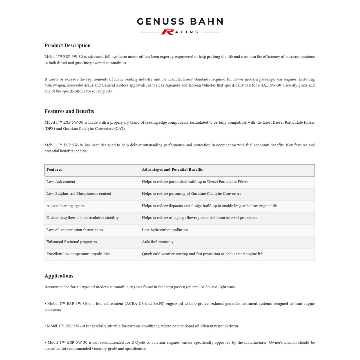 Mobil 1™ ESP 5W-30 has been designed to help deliver outstanding performance and protection in conjunction with fuel economy benefits. Key features and potential benefits include: