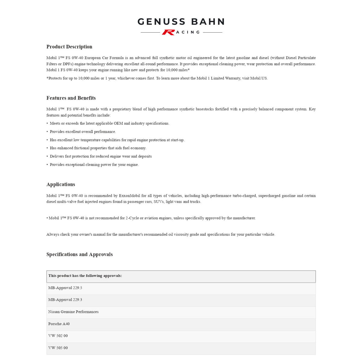 Mobil 1™ FS 0W-40 is made with a proprietary blend of high performance synthetic base stocks fortified with a precisely balanced component system. Key features and potential benefits include:
