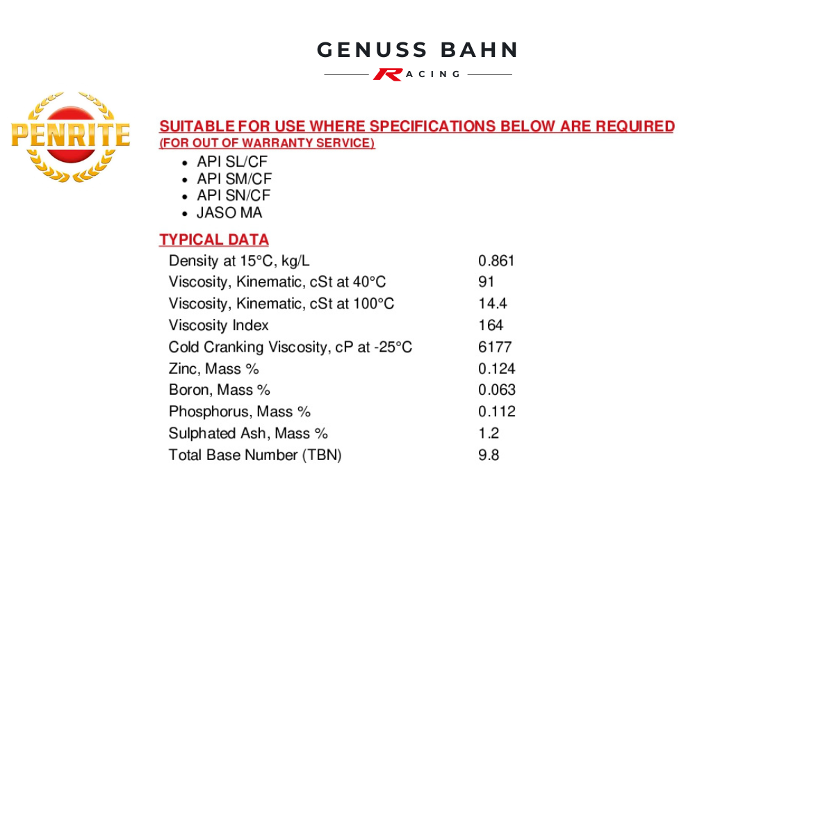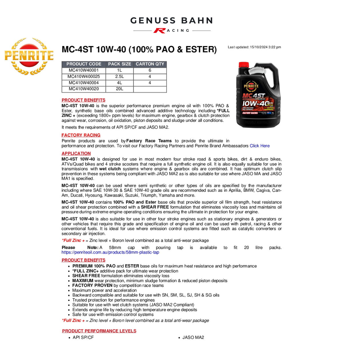 MC-4ST 10W-40 contains 100% PAO and Ester base oils that provide superior oil film strength, heat resistance and oil shear protection combined with a SHEAR FREE formulation that eliminates viscosity loss and maintains oil pressure during extreme engine operating conditions ensuring the ultimate in protection for your engine.