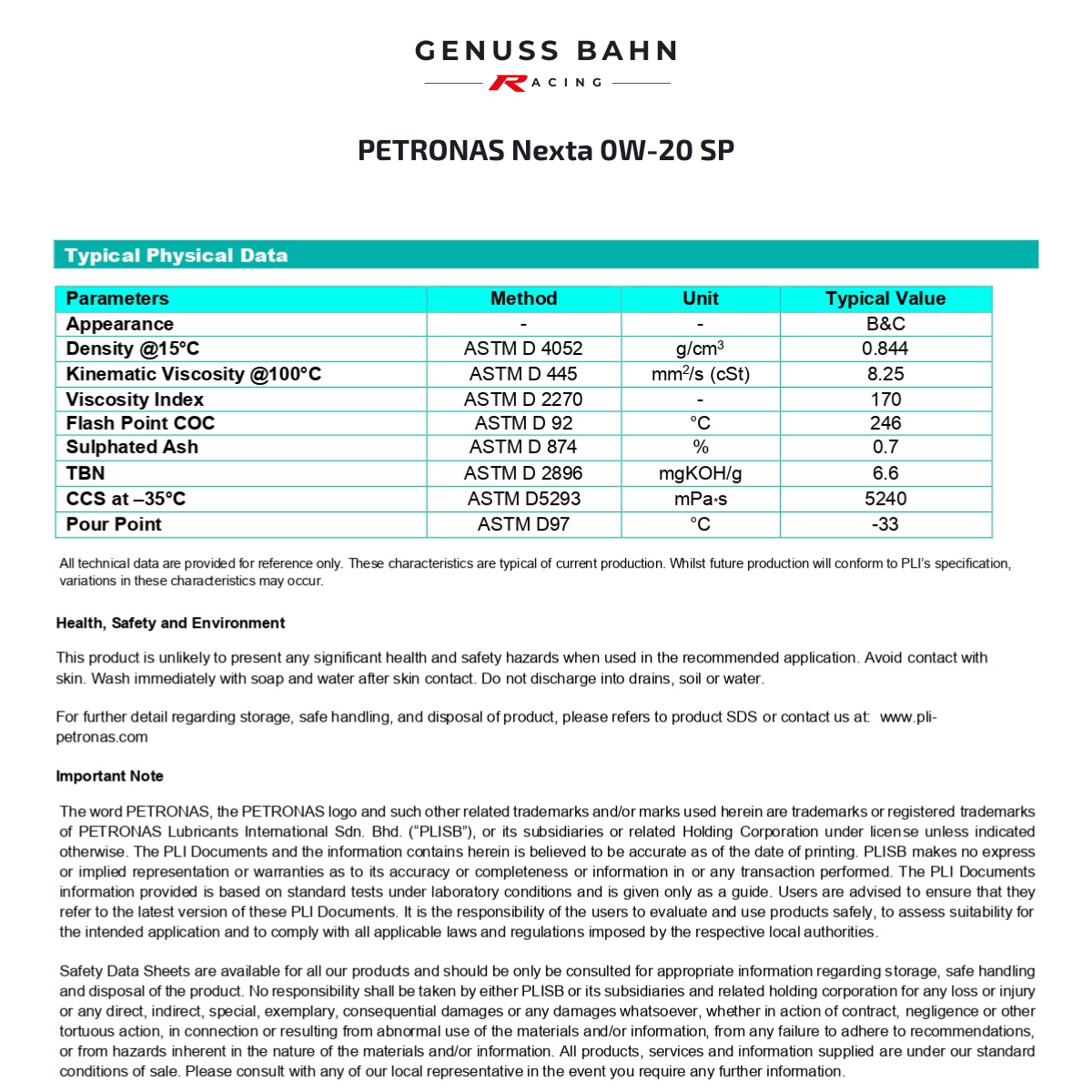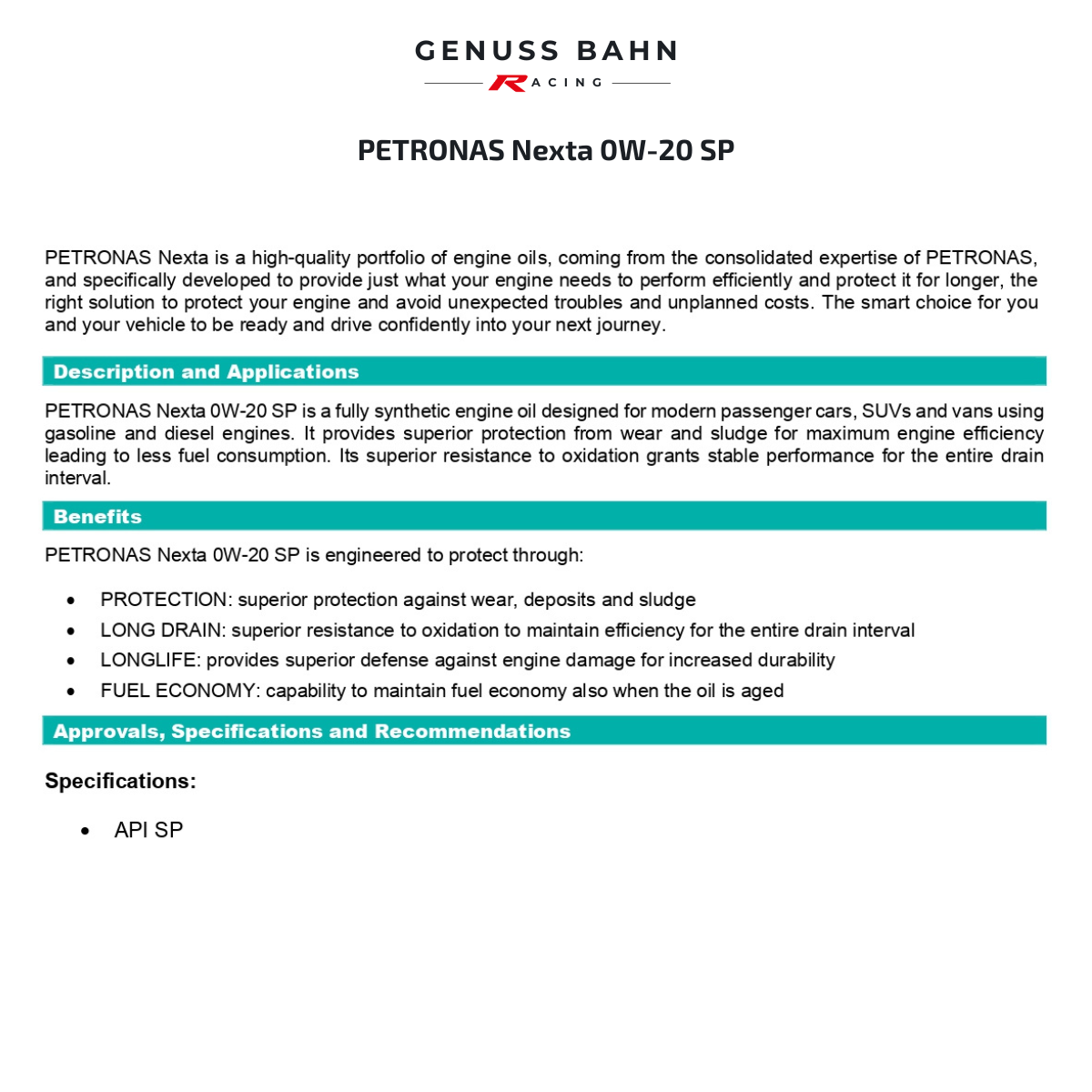PETRONAS Nexta 0W-20 SP is a fully synthetic engine oil designed for modern passenger cars, SUVs and vans using gasoline and diesel engines. It provides superior protection from wear and sludge for maximum engine efficiency leading to less fuel consumption. Its superior resistance to oxidation grants stable performance for the entire drain interval.