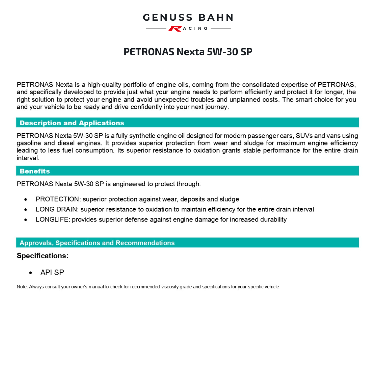 PETRONAS NeXta 5W-30 SP is a fully synthetic engine oil designed for modern passenger car using gasolin engines. It provides superior protection from wear and sludge for maximum engine efficiency leading to less fuel consumption. Its superior resistance to oxidation grants stable performance for the entire drain interval.