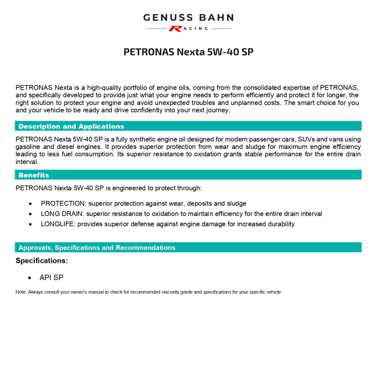 PETRONAS NeXta 5W-40 SP is a fully synthetic engine oil designed for modern passenger cars using gasoline engines. It provides superior protection from wear and sludge for maximum engine efficiency leading to less fuel consumption. Its superior resistance to oxidation grants stable performance for the entire drain interval.