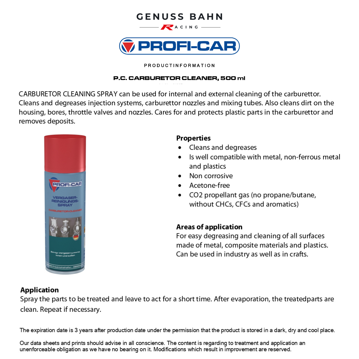 PROFI-CAR CARBURETOR CLEANER is useable for inside and outside cleaning of the carburetor. Cleans and regreases injection systems, carburetor nozzles and mixing pipes. Cleans also dirt from the carburetor box, drillings, throttles and pipes. Maintains and preserves plastic parts of carburetors and removes deposits.