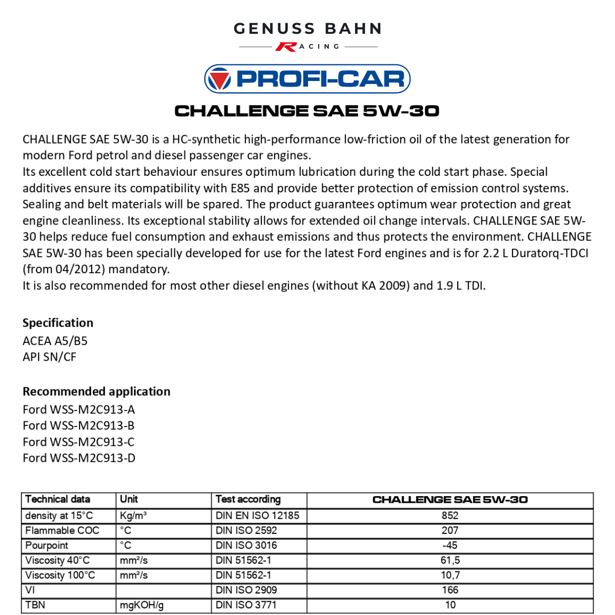 PROFI-CAR CHALLENGE SAE 5W-30 is a HC-synthetic high-performance low-friction oil of the latest generation for modern Ford petrol and diesel passenger car engines.