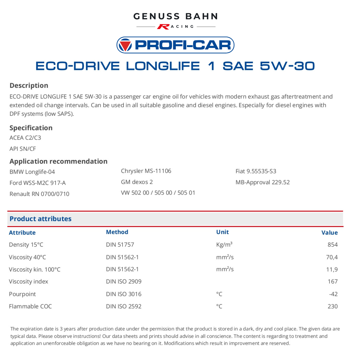 PROFI-CAR ECO-DRIVE LONG LIFE 1 SAE 5W-30 is a passenger car engine oil for vehicles with modern exhaust gas aftertreatment and extended oil change intervals. Can be used in all suitable gasoline and diesel engines. Especially for diesel engines withDPF systems (low SAPS).