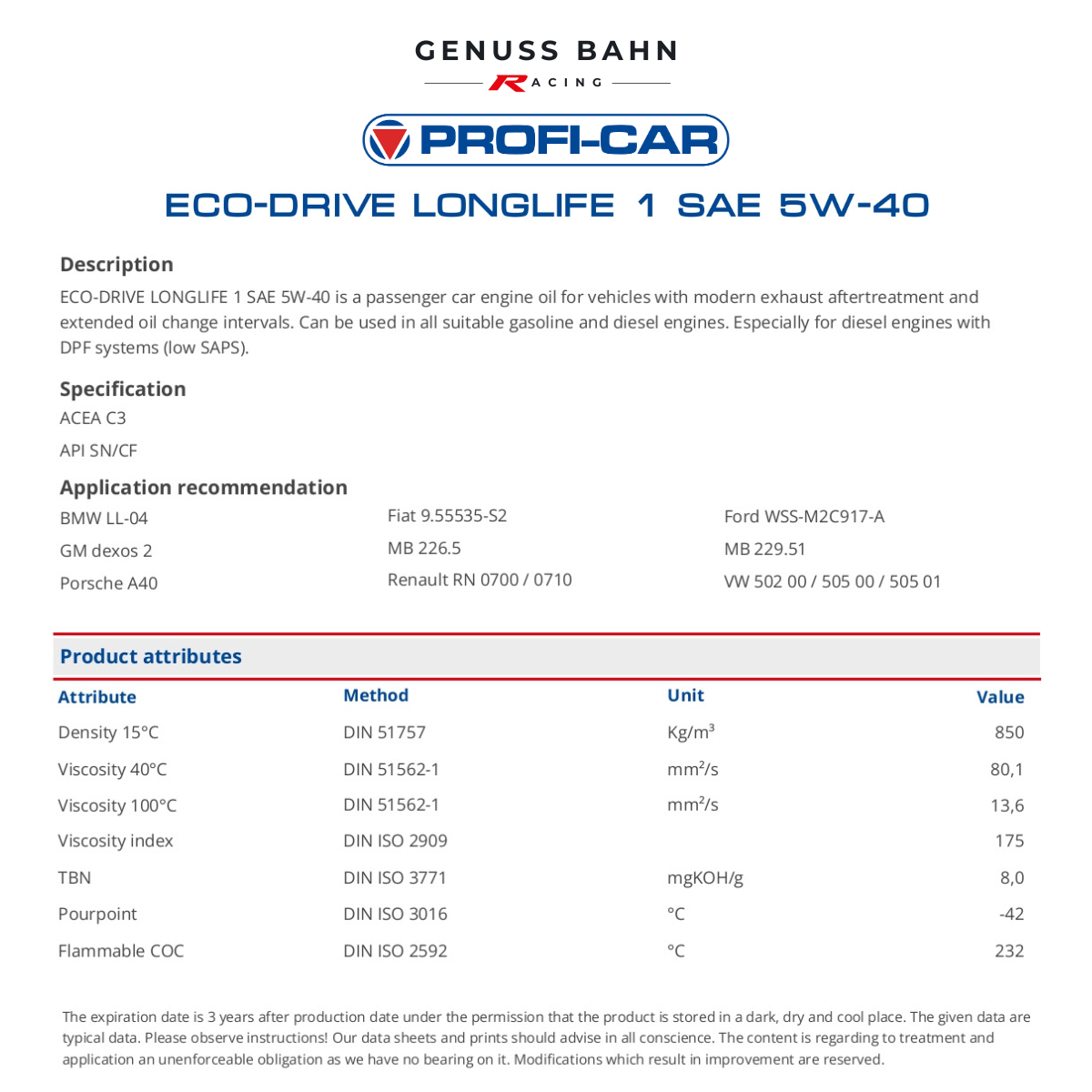 PROFI-CAR ECO-DRIVE LONG LIFE 1 SAE 5W-40 is a passenger car engine oil for vehicles with modern exhaust aftertreatment and extended oil change intervals. Can be used in all suitable gasoline and diesel engines. Especially for diesel engines withDPF systems (low SAPS).