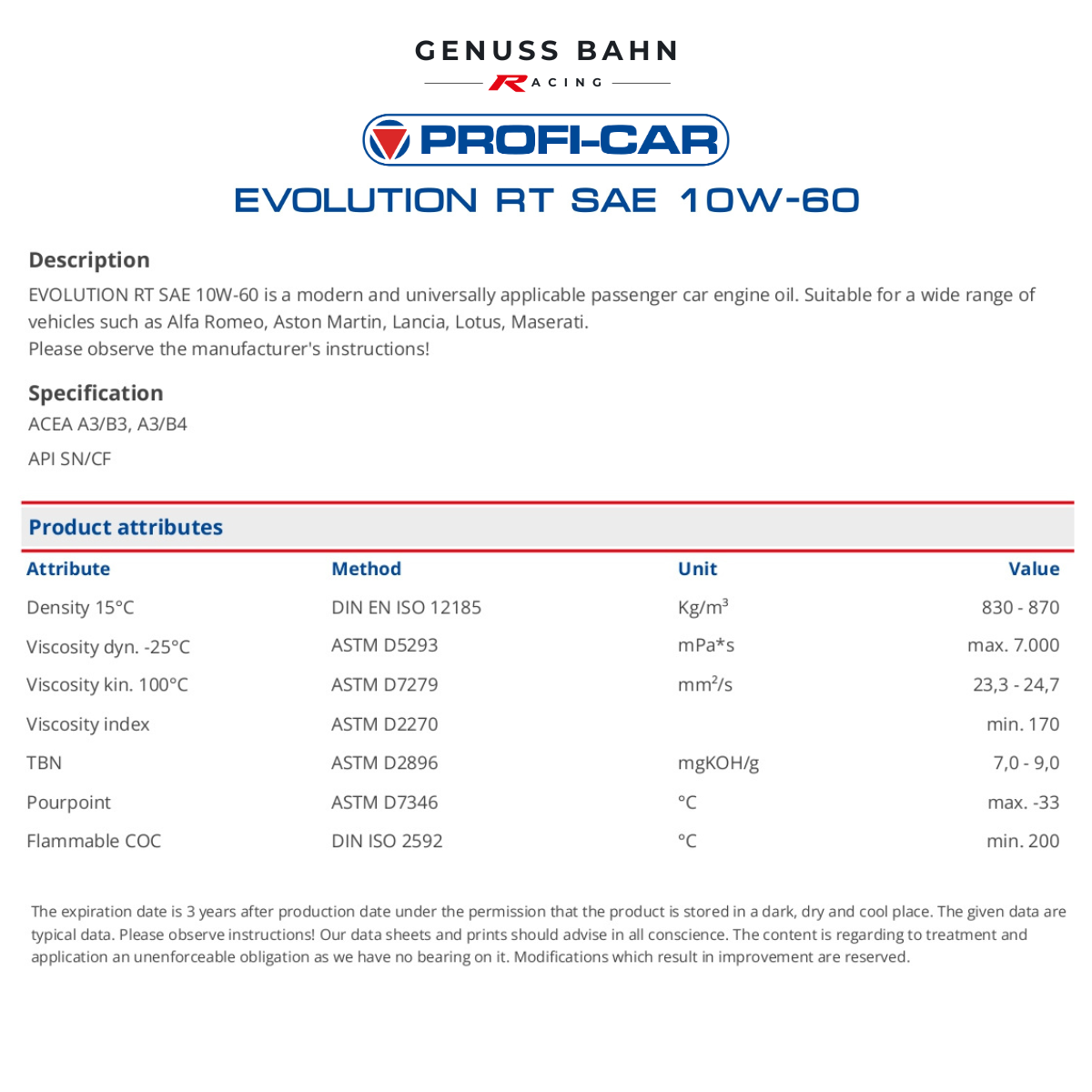 PROFI-CAR EVOLUTION RT SAE 10W-60 is recommended for all passenger car – gasoline – and diesel engines, also for turbo – diesel – and catalytic converter – versions. Also suitable for motorcycles with 4-stroke engines on roads as well as off-road.