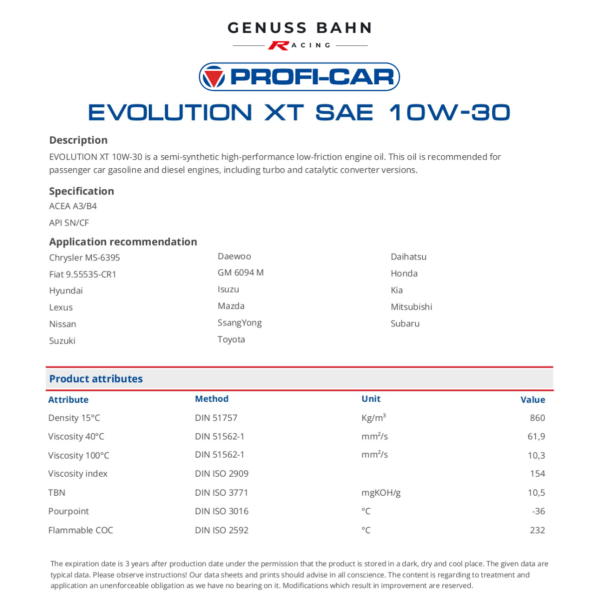 PROFI-CAR EVOLUTION XT SAE 10W-30 is a semi-synthetic high-performance low-friction engine oil. This oil is recommended for passenger car gasoline and diesel engines, including turbo and catalytic converter versions.