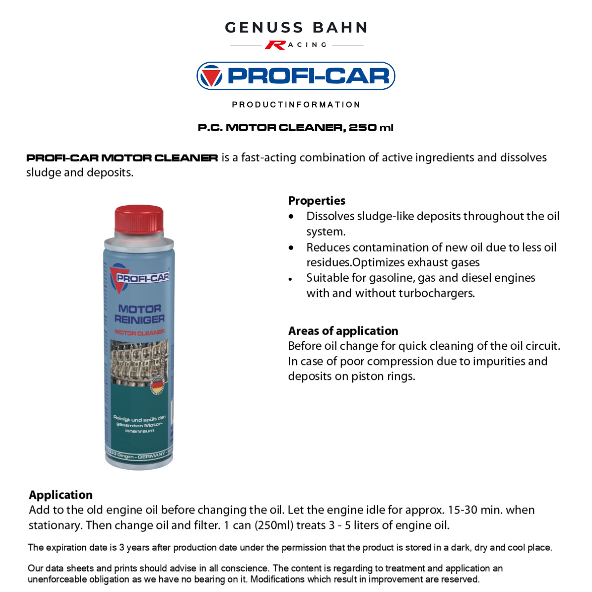 PROFI-CAR MOTOR CLEANER cleans and flushes the motor compartment. Concentrated cleaning additives dissolve impurities (e.g. black sludge, carbon deposits, etc.). After treatment with PROFI-CAR MOTOR CLEANER the new oil can develop its full capacity. The motor runs with less wear and develops again a better performance, thus the exhaust emissions are optimized and an insufficient lubrication is prevented.