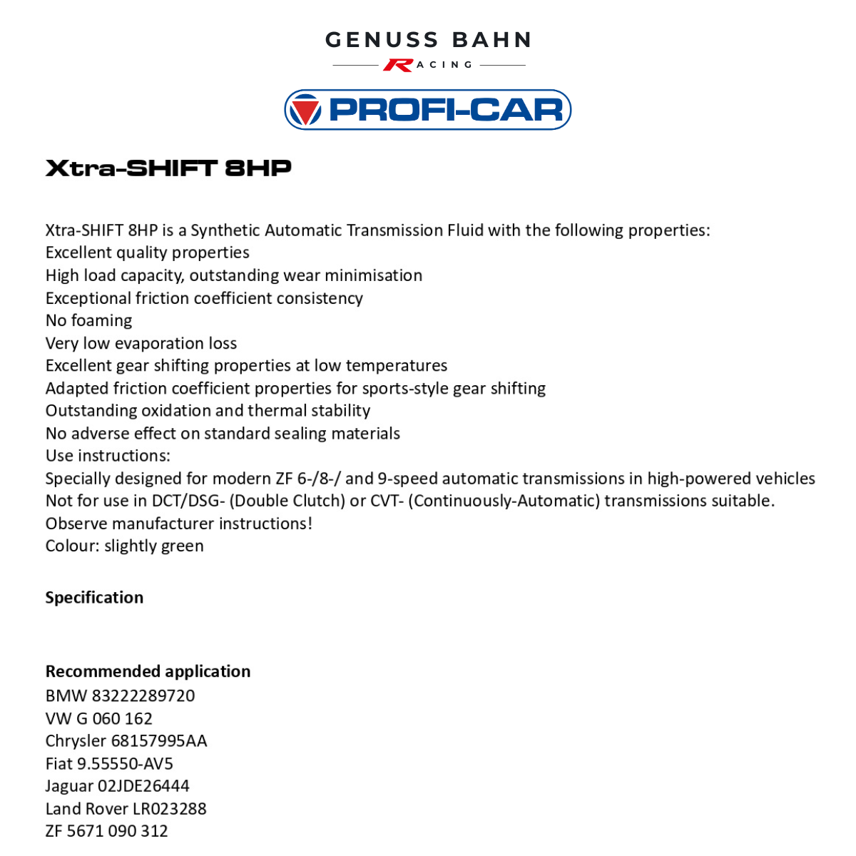 PROFI-CAR Xtra-SHIFT 8HP is a Synthetic Automatic Transmission Fluid specially designed for modern ZF 6-/8-/ and 9-speed automatic transmissions in high-powered vehicles.