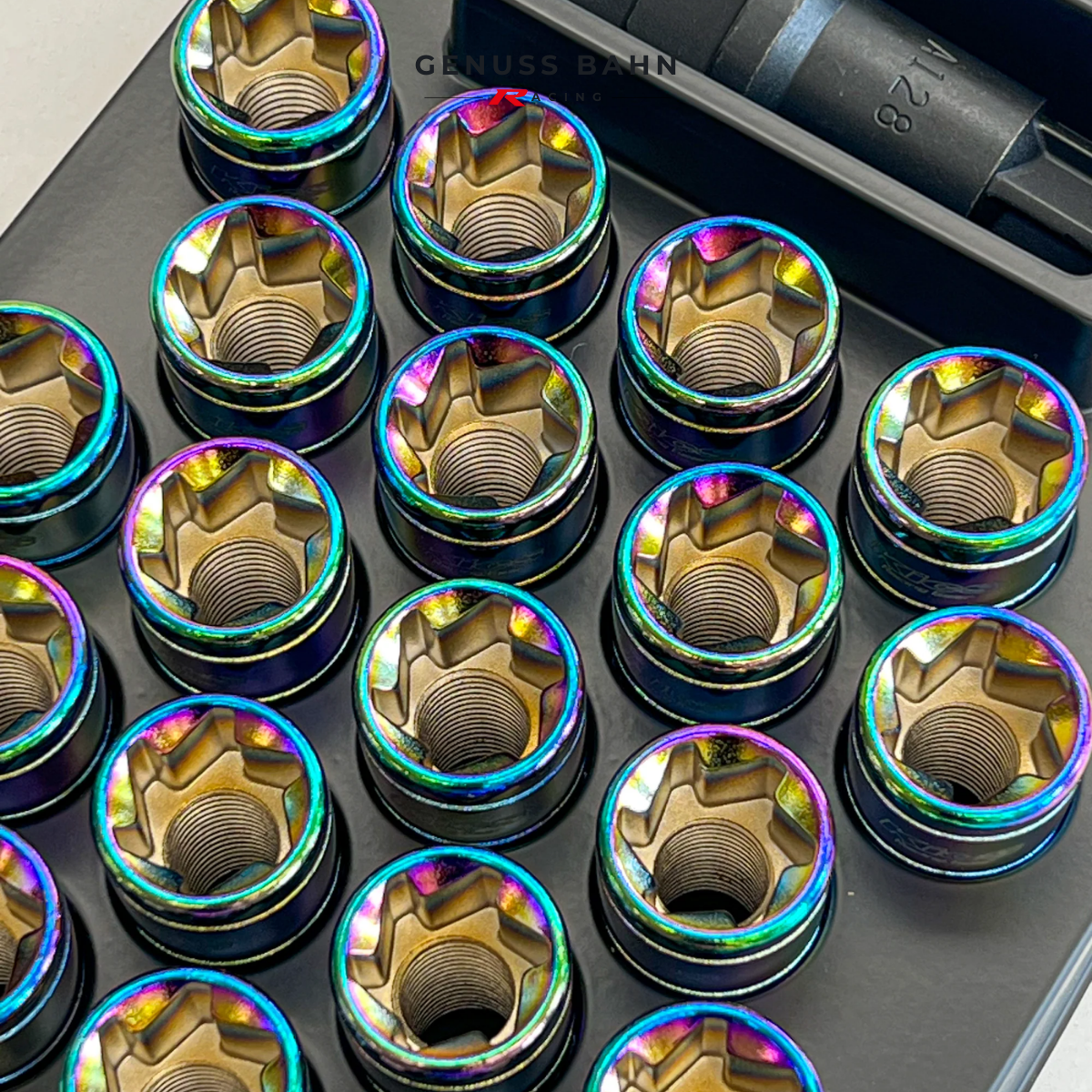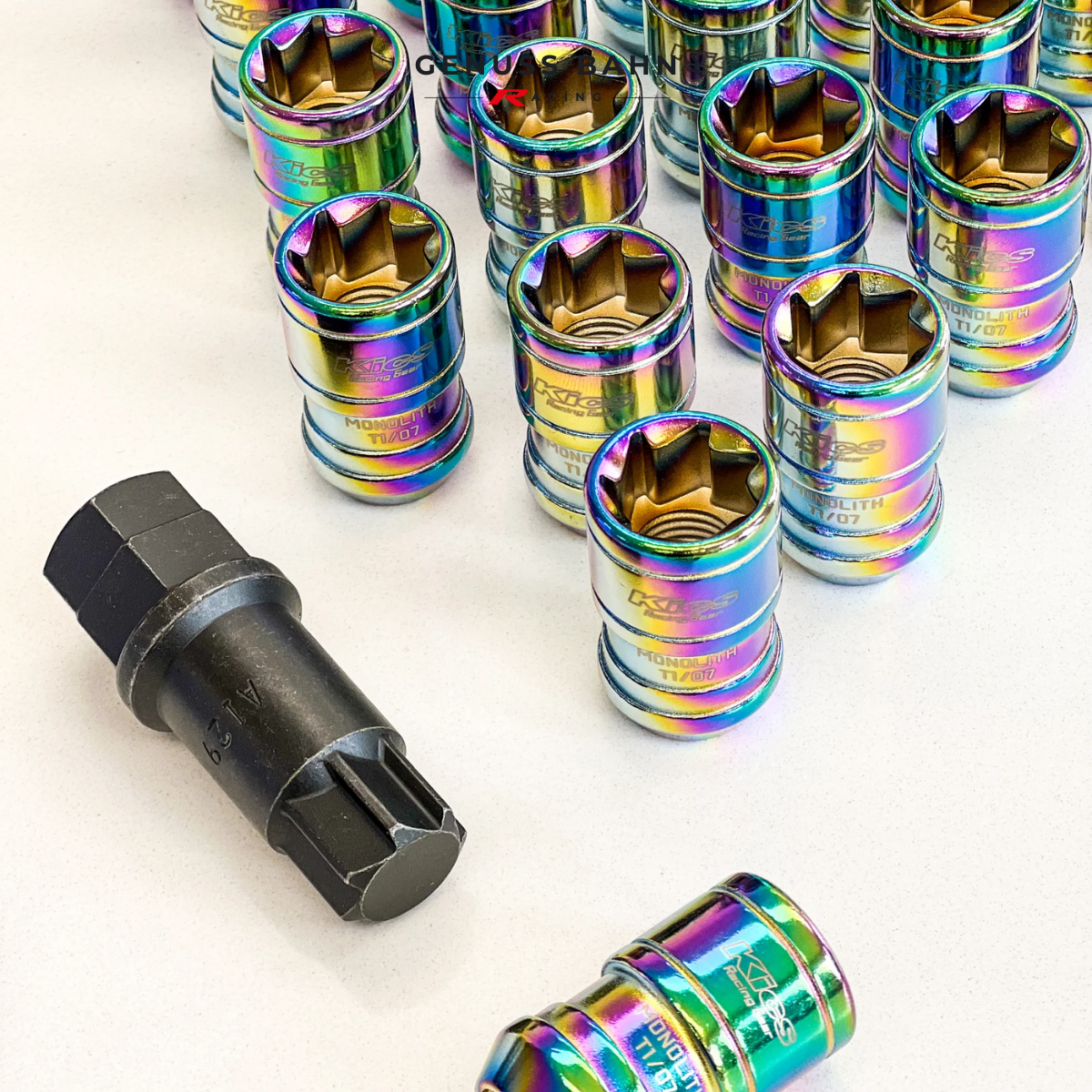 The Project Kics MONOLITH T1/07 Wheel Nuts are a designed for wheels with smaller lug holes. These are an open end type nut, but there are inner caps available. For the M14 thread sizes, the outer diameter is just 22mm. These are constructed with SCM435 forged steel. The pattern is a “Bull Lock TUSKEY” with outstanding anti-theft effects. These are available in 1.5 threads and are available in Glorious Black or Neochro colors.